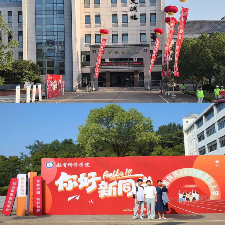 文渊楼前红灯高悬,横幅醒目,“黄山松迎客,教科心育苗”等标语满载期许。报到点周边,精心布置的指引牌与欢迎展板错落有致,处处弥漫着热烈而温馨的迎新气息,使初入校园的新生及家长瞬间感受到与学院的亲近。
