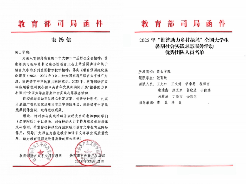 近日,2025年“推普助力乡村振兴”全国大学生暑期社会实践志愿服务活动评选结果正式揭晓。我院学子参与的语润“源”梦先锋推普暑期实践团队荣获优秀团队称号,受到教育部语言文字应用管理司和共青团中央青年发展部的通报表扬。
