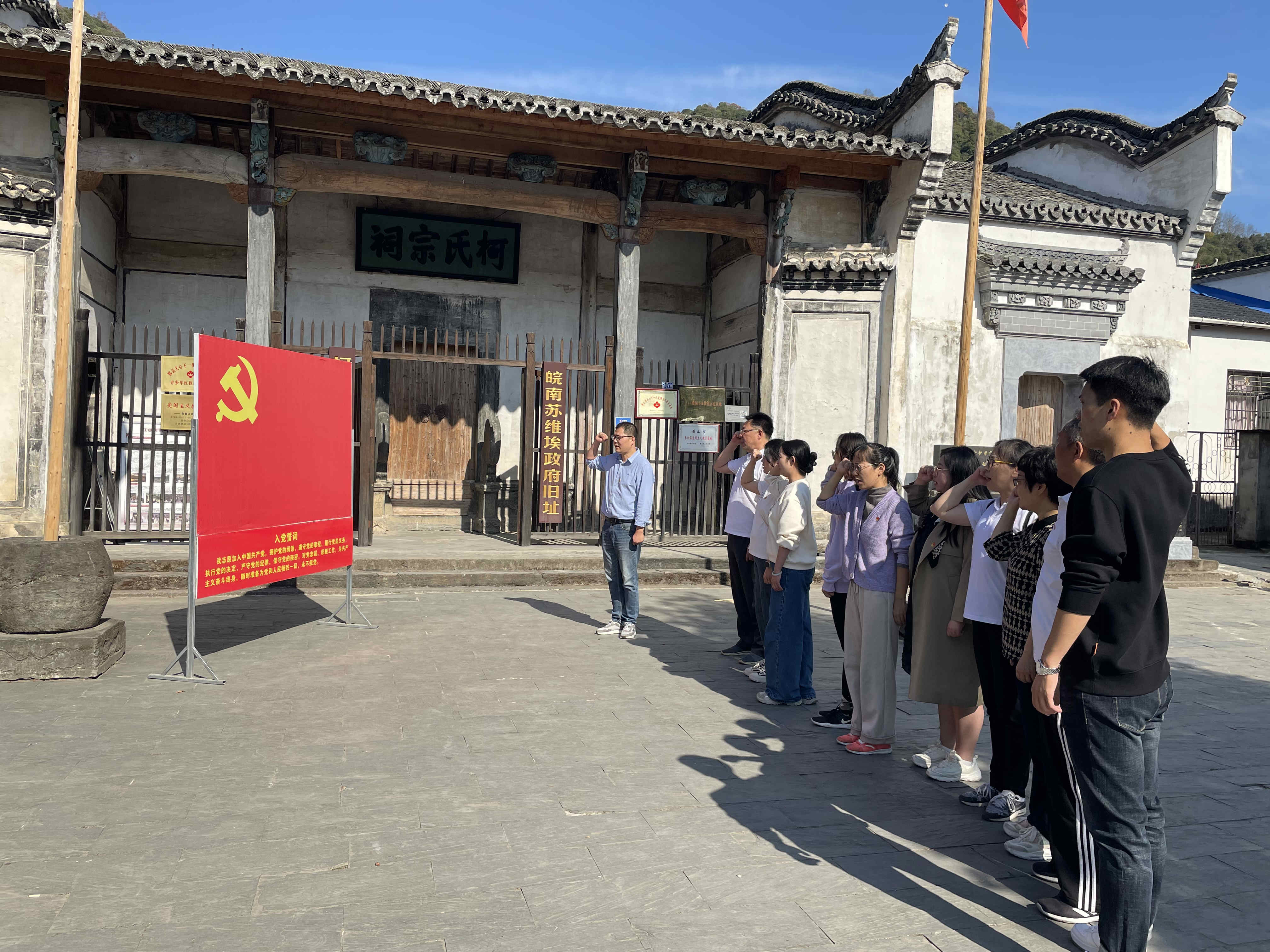 在皖南第一个苏维埃红色政权所在地柯村,在当年的暴动指挥部、现在的暴动纪念馆——柯家祠堂前,全体党员面对鲜红的党旗,重温入党誓词,作出庄严宣誓。随后在解说员的带领下进入馆内,仔细观看沙盘模型、图片资料和历史遗迹,认真聆听现场讲解,重温轰轰烈烈、波澜壮阔的革命历史,追忆方志敏、寻淮洲等革命先辈的英雄事迹,感受他们英勇无畏的牺牲精神。一份份史料、一件件遗物、一幕幕往事,承载着岁月峥嵘历久弥新的革命记忆,彰显出革命先烈可歌可泣的壮烈情怀。党员教师们以历史追溯者的身份,置身于穿越时空的精神旅程,思想受到洗礼,精神备受鼓舞。
