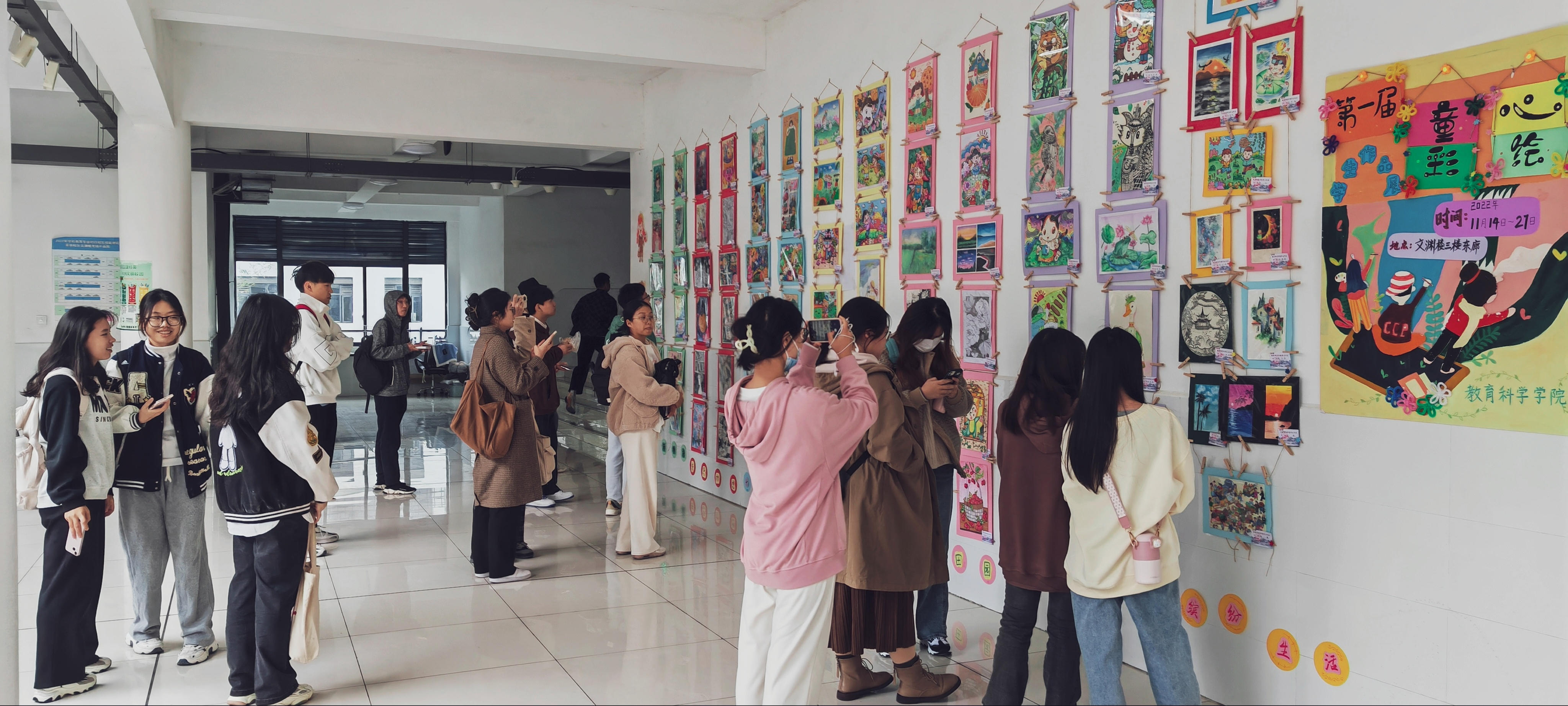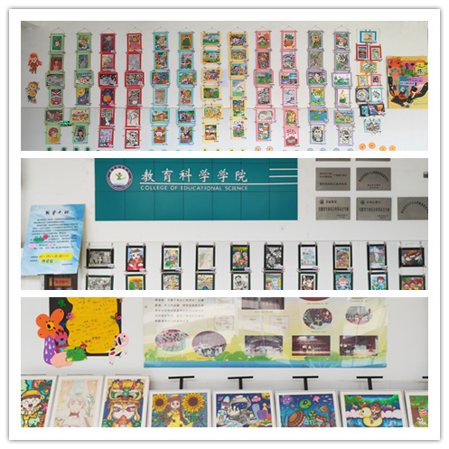 这些作品风格各异,分“国潮物语”、“奇思妙想”、“七彩的梦”、“童梦时光”、“绿色田园”、“动物王国”、“缤纷生活”等七个板块展出。一张张人物画将画中之人的动作神态刻画得活泼生趣、惟妙惟肖。一幅幅风景画给人带来身临其境式的多彩审美体验。一时之间,在同学们满溢的青春气息与各有千秋之美的彩绘画作共同点缀之下,晚秋时节的教科院依旧呈现一片朝气蓬勃的景致。