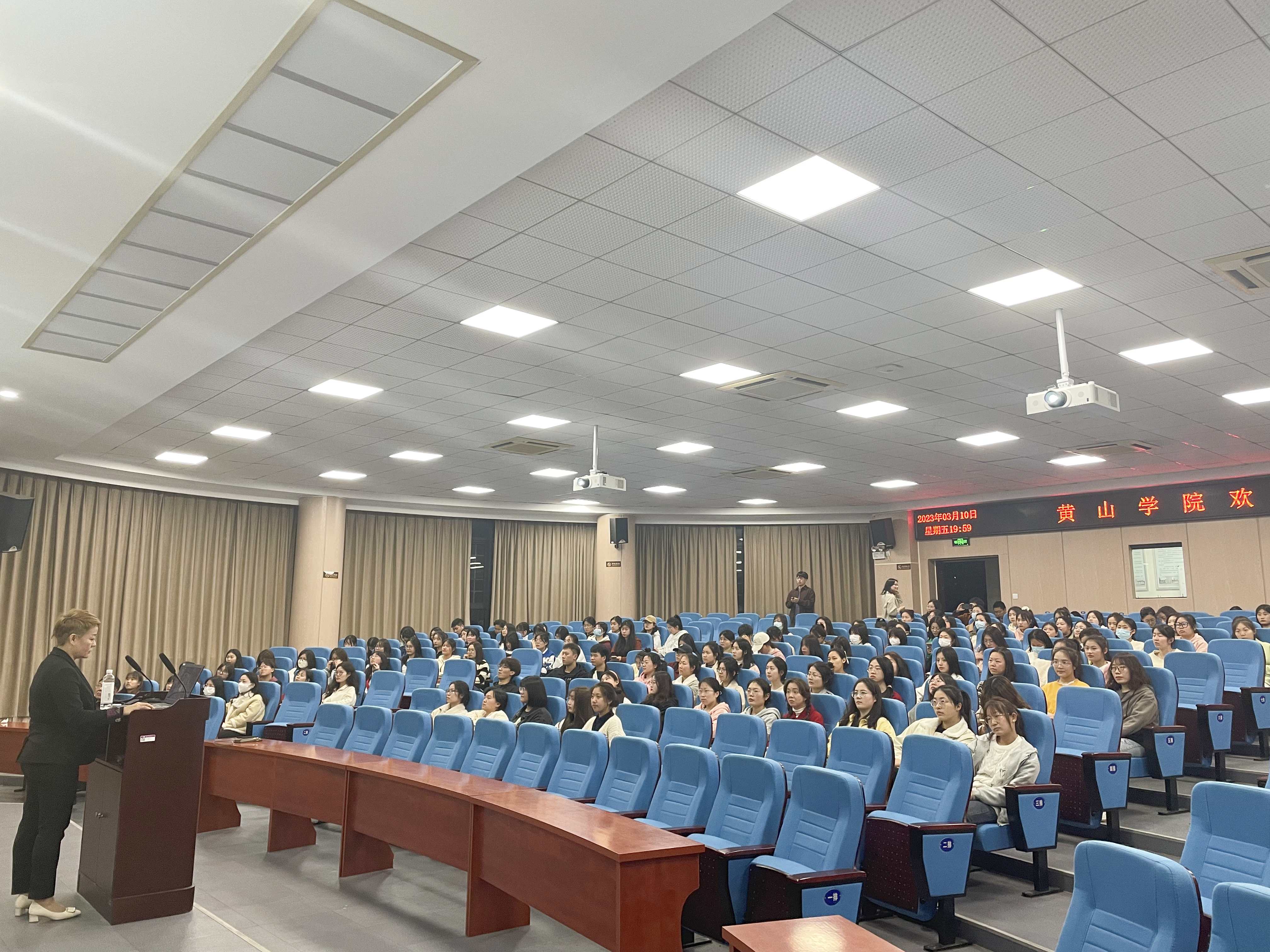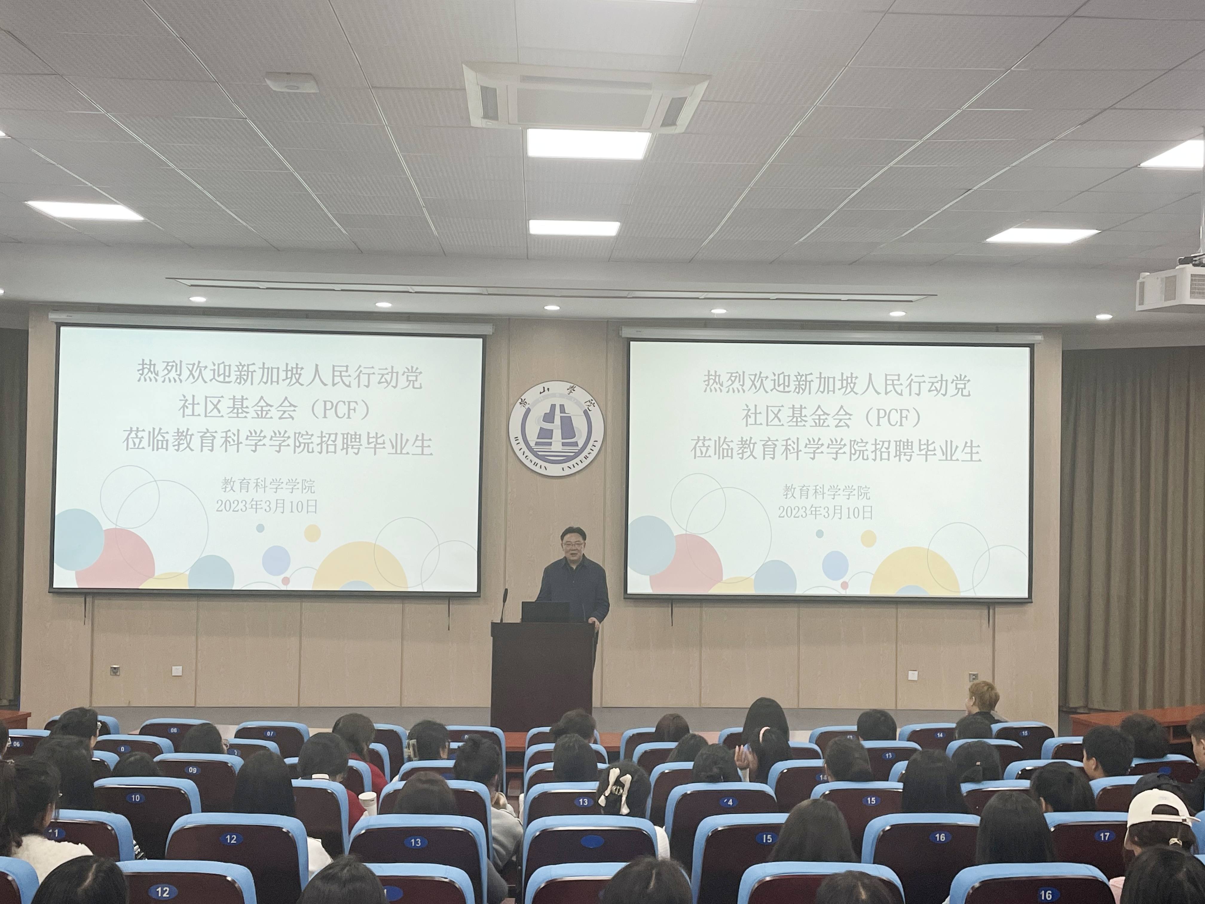 新加坡PCF社区基金会代表团孙雯莉老师从经济发展、教育基础设施、居住环境、交通设施等方面向学生介绍了新加坡的就业环境,并就PCF社区基金会幼儿园的基本业务、管理制度、工资待遇等方面进行了详细介绍并回答了同学们的提问。
