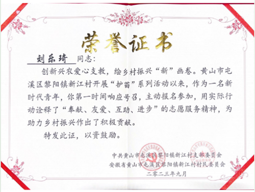 信中写到,在黄山市屯溪区黎阳镇新江村抓好乡村教育,助力乡村振兴,开展‘护苗’等一系列活动中,贵校学生积极响应参加,协助新江村村委会做好疫情防控、辅导留守儿童、电商宣传农产品、宣传防范电信诈骗知识等各项工作,在助力乡村振兴一线,留下了忙碌身影。在志愿服务活动中,努力为乡村发展做出贡献,展现了当代大学生的优良素质和担当意识,其优异表现赢得了新江村村民的一致肯定和好评。