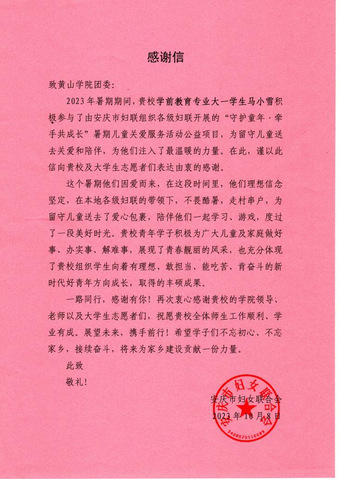 近日,安庆市妇女联合会致函我校,对我校英国正版365首页2022级学前教育班马小雪同学表达感谢,充分肯定了该生为“守护童年,牵手共成长”暑期儿童关爱服务活动公益项目的参与付出,大力表扬了该生为广大儿童及家庭做好事、办实事、解难事的无私奉献,着重赞许了该生有理想、 敢担当、能吃苦、肯奋斗的青年担当。
