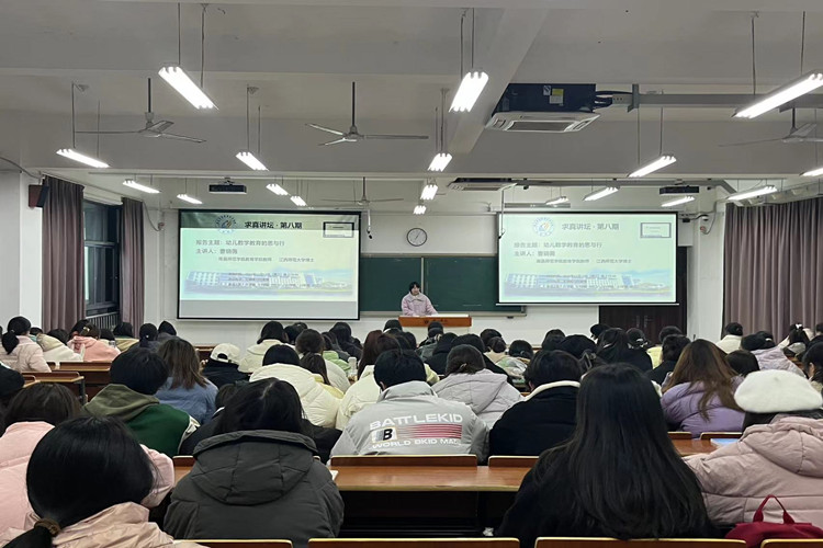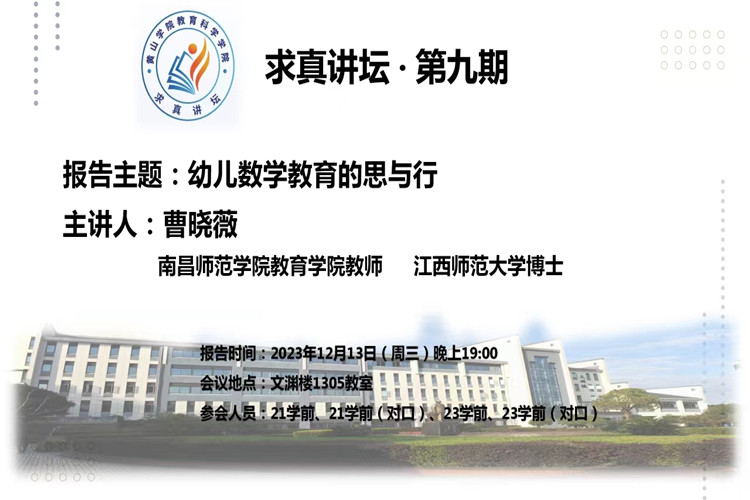 12月13日晚,英国正版365首页求真讲坛第九期在率水校区文渊楼1305教室举行。南昌师范学院曹晓薇老师应邀通过线上的方式,为我院学前教育专业学生作题为“幼儿数学教育的思与行”的学术报告。报告会由学前教育教研室主任胡梓滟主持,学前教育专业全体同学参加了报告会。