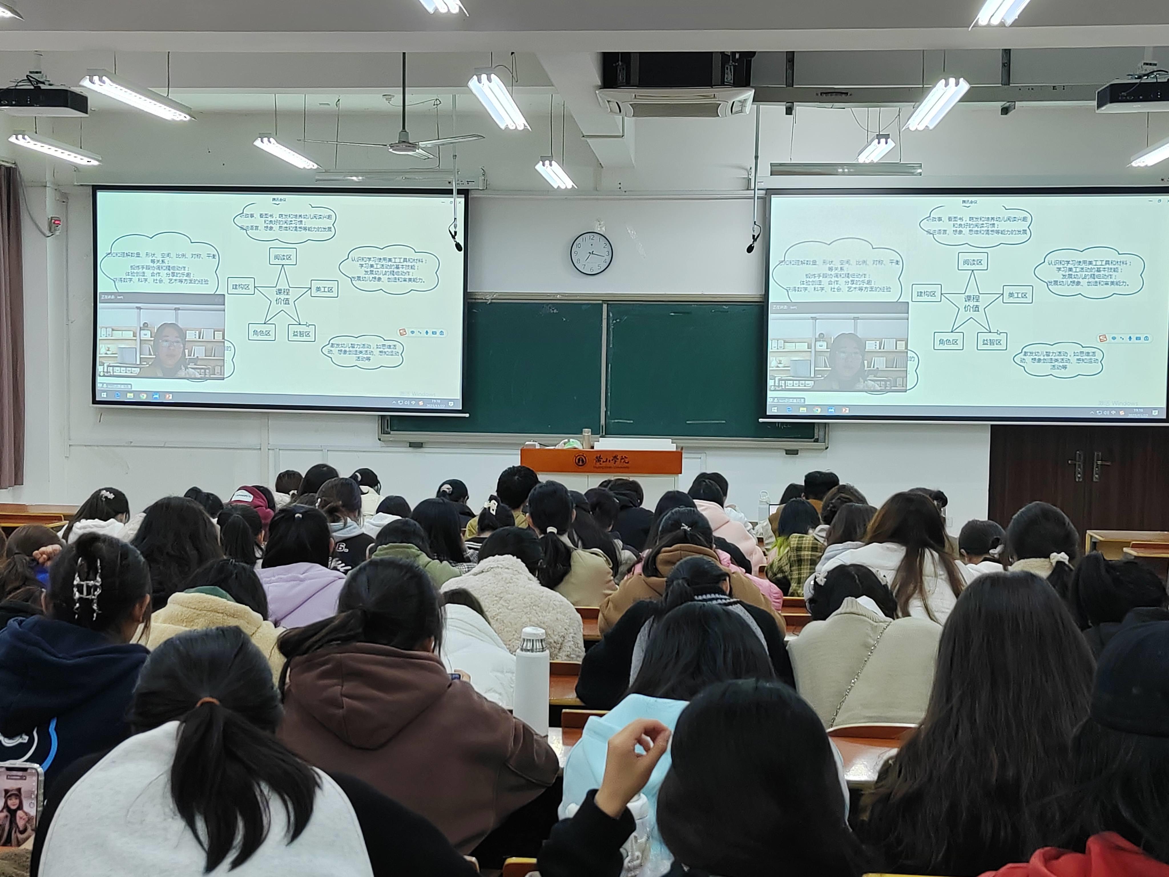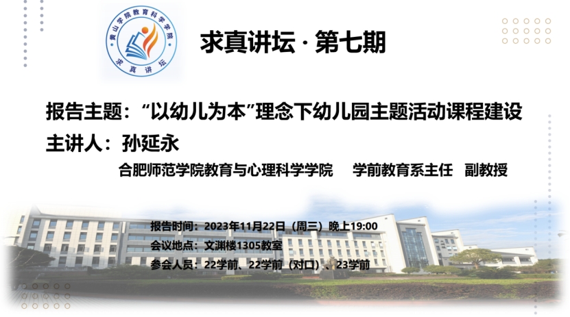 11月22日晚,求真讲坛(第七期)在率水校区文渊楼1305教室举行。合肥师范学院教育与心理科学学院学前教育系主任孙延永副教授应邀作题为“以幼儿为本”理念下幼儿园主题活动课程建设的学术报告。报告通过腾讯会议线上讲座,学前教育专业部分师生在文渊楼1305观看了此次报告会。报告由英国正版365首页学前教育教研室主任胡梓滟主持。