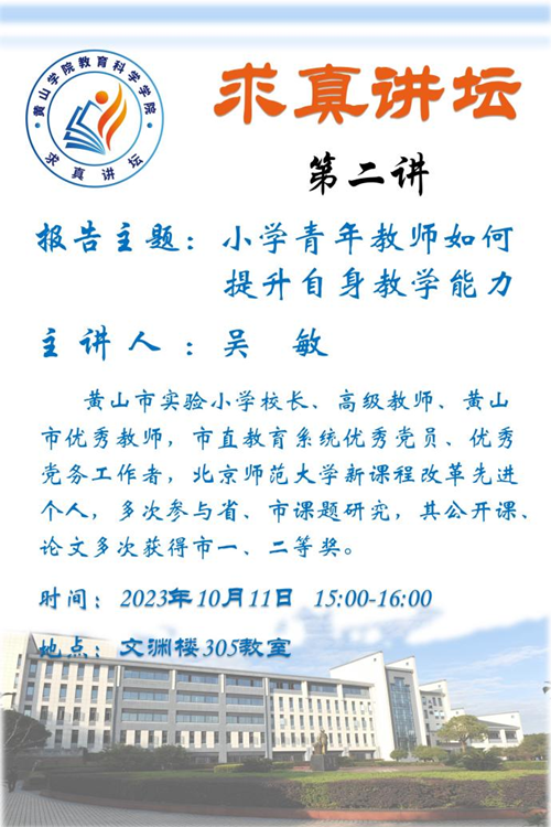 10月11日下午,英国正版365首页邀请了黄山市实验小学校长吴敏在文渊1305教室进行了《小学青年教师提升自身教学能力的途径探索》的报告,20小教、21小教、22小教专升本共192名学生聆听了报告会。