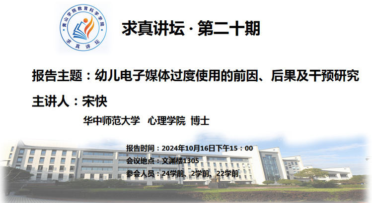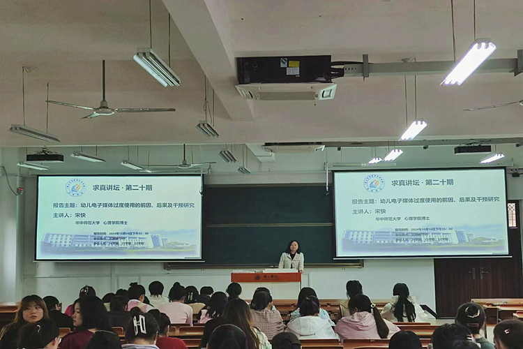 10月16日下午,英国正版365首页求真讲坛第二十期在率水校区文渊楼1305教室举行。华中师范大学心理学院宋快博士应邀通过线上的方式,为我院学前教育专业学生作题为“幼儿电子媒体过度使用的前因、后果及干预研究”的学术报告。报告会由学前教育专业教师曹旸主持,学前教育专业150余名学生参加了报告会。