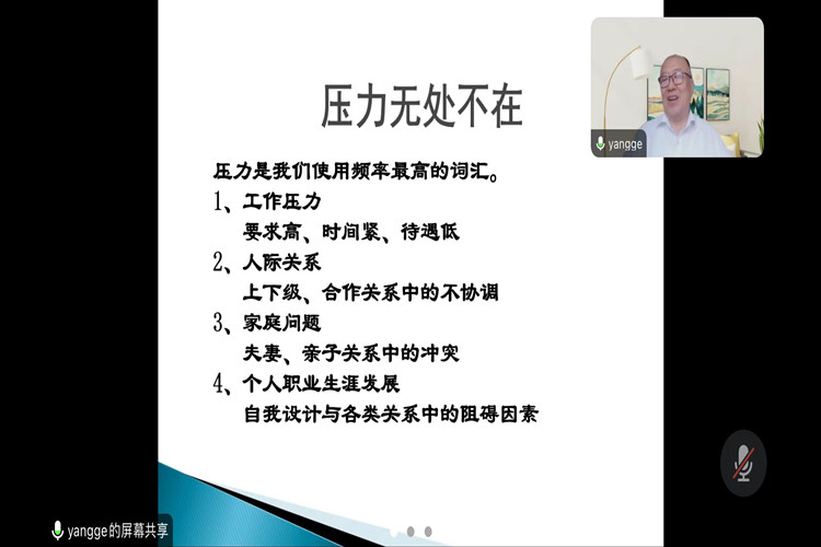 在讲座中,杨教授以自身经历为例,通过畅谈人生压力所在、学习心理学对压力感知和调试的作用,大学生和青年教师应对压力的具体策略来指导我院师生的压力管理。杨教授讲述个人经历娓娓道来,对压力情境描述栩栩如生,语言亲切温暖、幽默风趣。