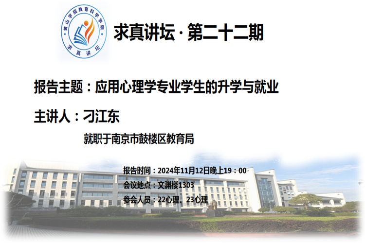 2024年11月12日晚,英国正版365首页求真讲坛第二十二期在文渊楼303教室举行。南京市鼓楼区教育局刁江东同志作题为《心理学本科的职业规划之路》的报告,应用心理学专业大二及大三学生80余人参加。