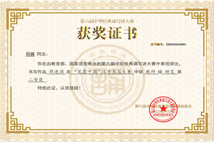 近日,由教育部、国家语言文字委员会(简称国家语委)共同主办的第六届中华经典诵写讲大赛全国总决赛获奖名单正式公布。我院郑藤老师书法作品“笔墨中国”汉字书写大赛教师组硬笔类二等奖。