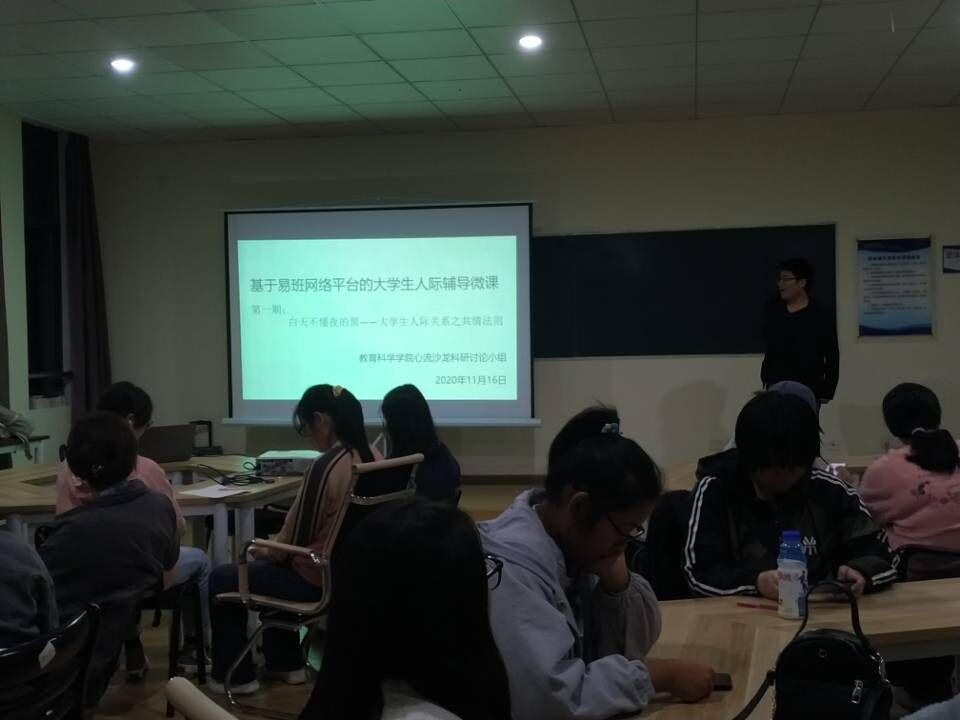 20201112日晚上,英国正版365首页心流沙龙科研讨论小组于率水校区文渊楼1501教室内开展了基于网络易班平台的大学生人际辅导微课前测活动,后续实验活动相继开展。此团体辅导活动由前测、八期易班微课、后测三个部分组成,由科研讨论小组组织随机抽取的同学们观看易班微课视频,每一期的活动都与大学生人际交往关系主题息息相关。