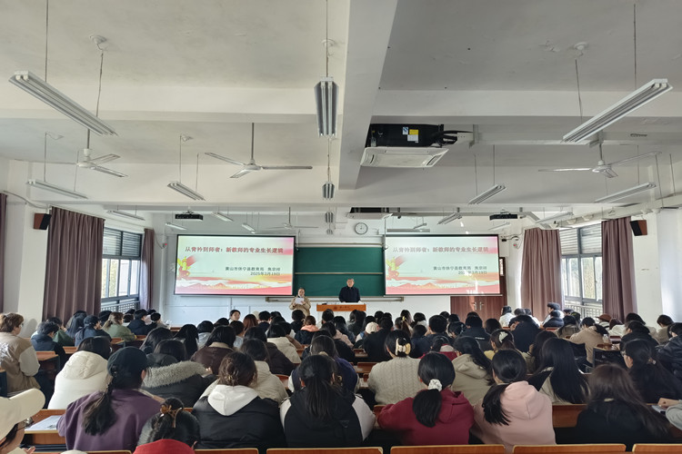 2025年3月19日下午,英国正版365首页第三十期求真讲坛在文渊楼1305教室举行。黄山市休宁县海阳第二初级中学校长焦宗祥老师应邀为我院小学教育专业学生作主题为“从青衿到师者:新教师的专业生长逻辑”的讲话,小学教育专业100余名学生参与此次讲坛的学习活动。
